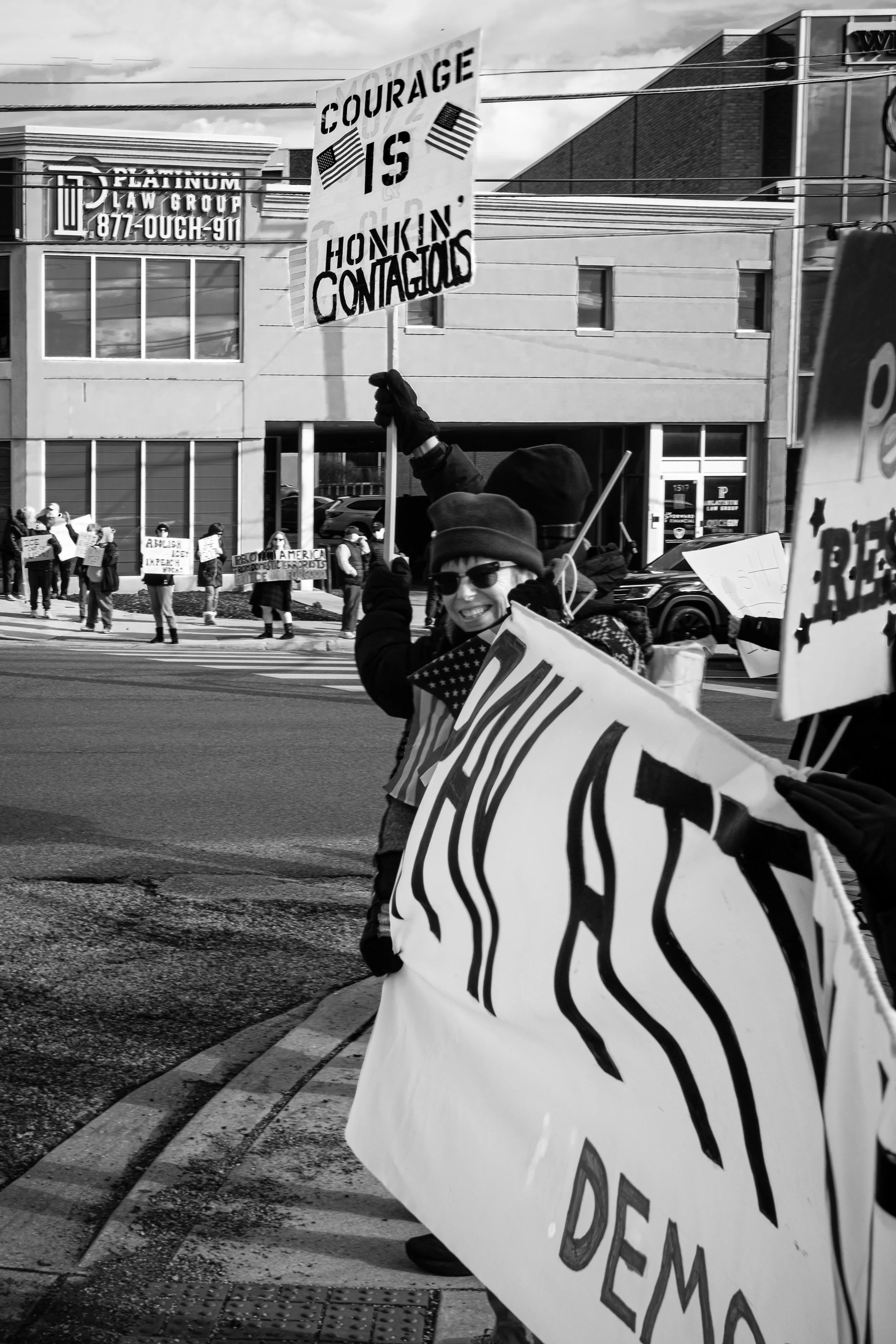 A LOCAL “FIGHT THE TRUMP TAKEOVER” SIGN WAVE IN PROTEST OF TEXAS REDISTRICTING